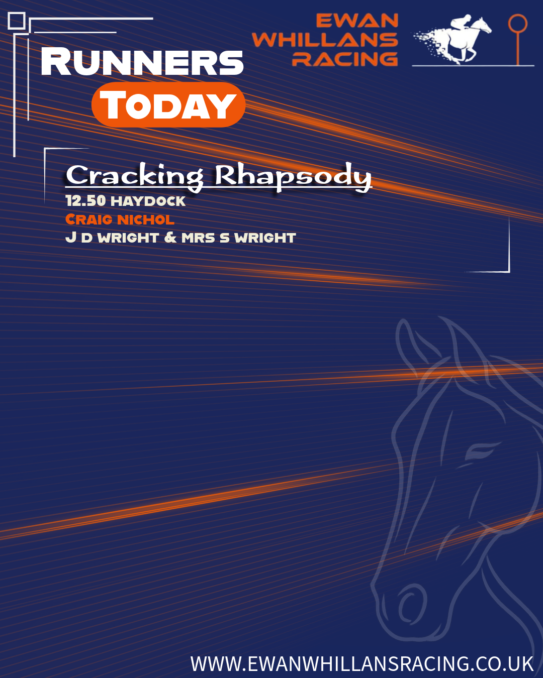 We have one runner today for Ewan Whillans Racing, with Cracking Rhapsody lining up in the 12:50 at Haydock, ridden by Craig Nichol.