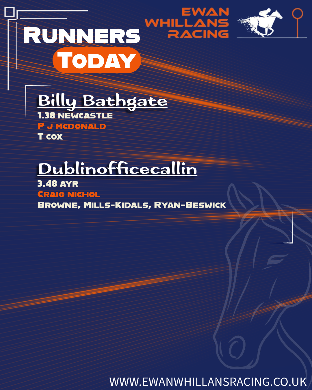 Two runners, two very different profiles, but both heading into their races with legitimate hopes of running well. Billy Bathgate brings consistency and experience to Newcastle, while Dublinofficecallin looks to progress again at Ayr following his recent run.